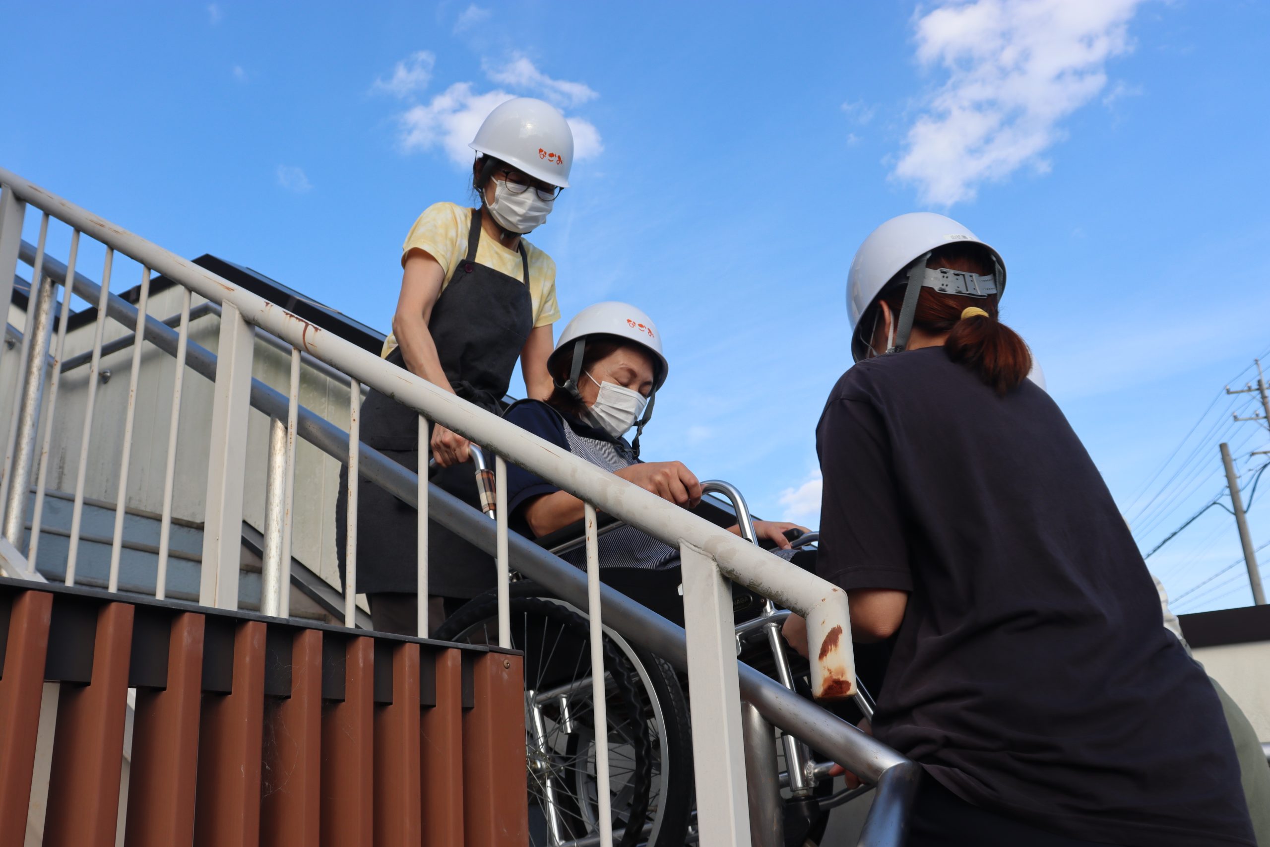経験豊富な職員でも人を乗せた車椅子を階段から降ろすのは初めてのことが多く、声掛けのタイミングや連携の大切さを実感しました。