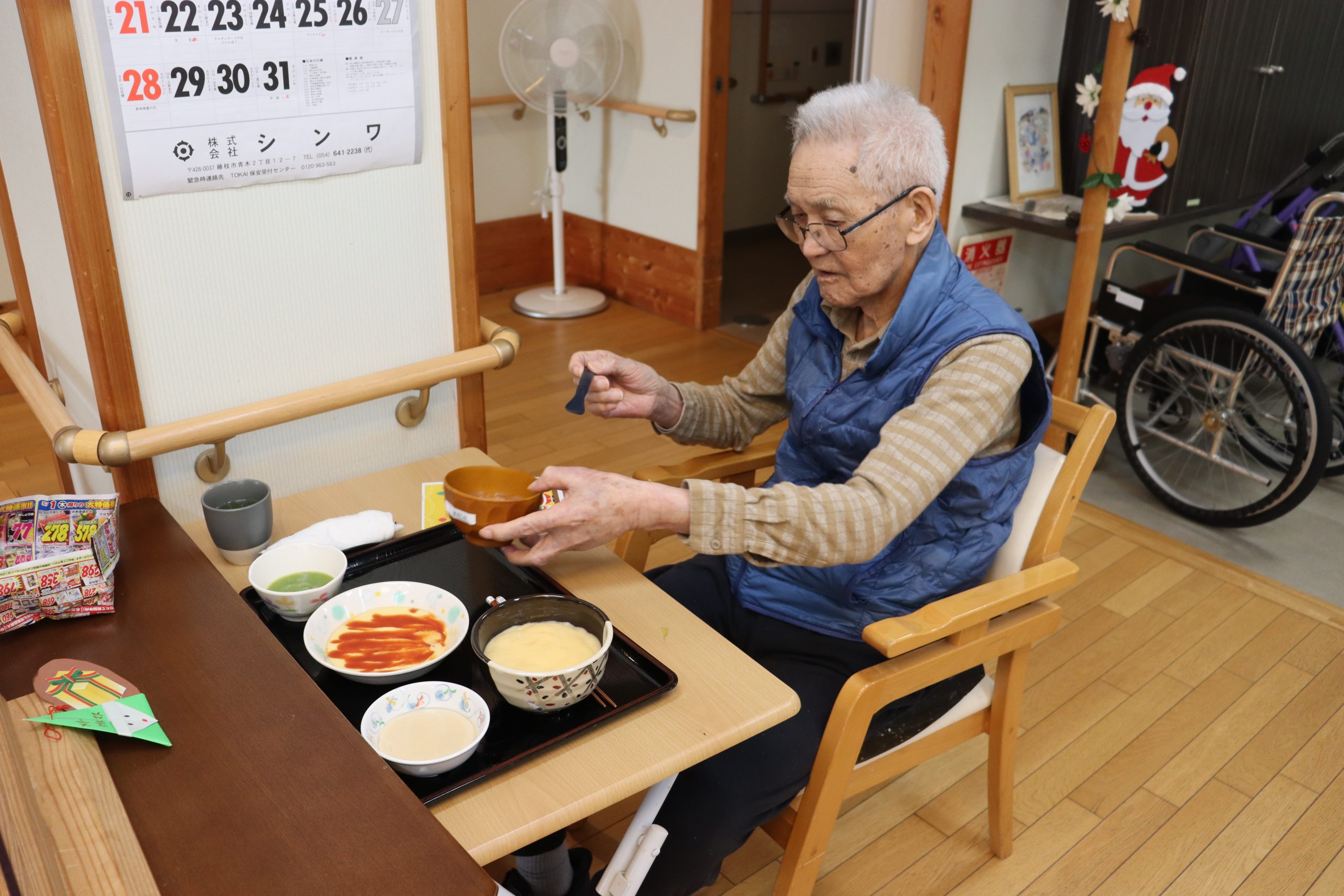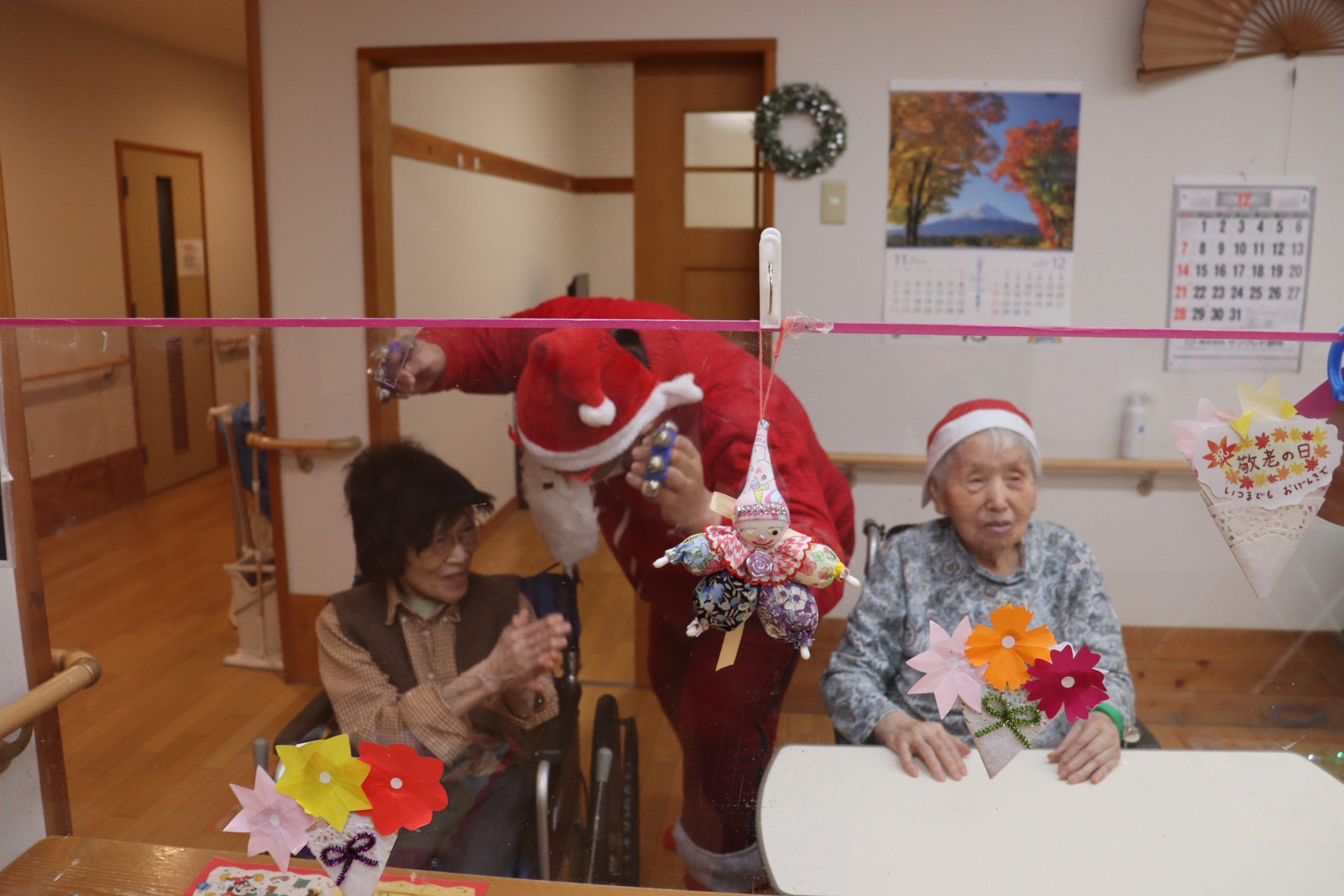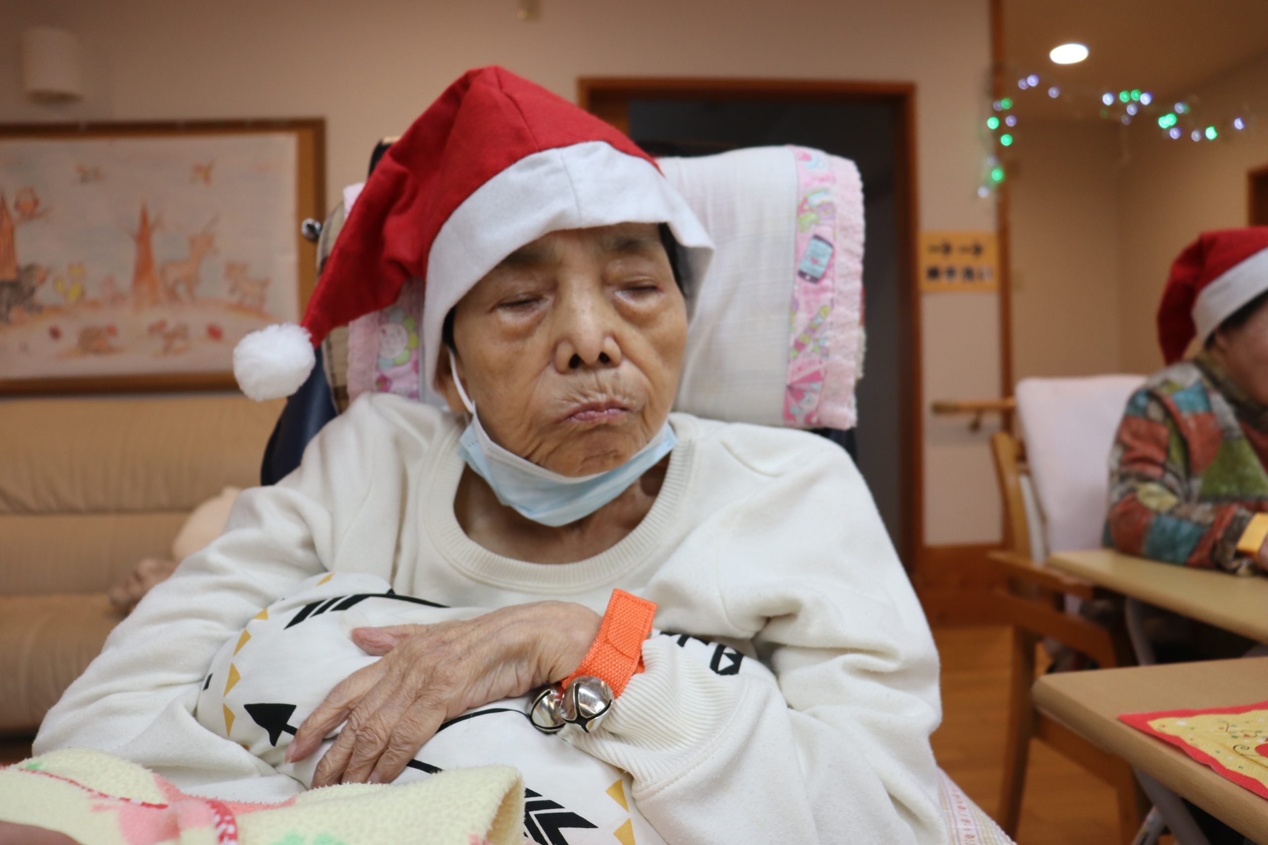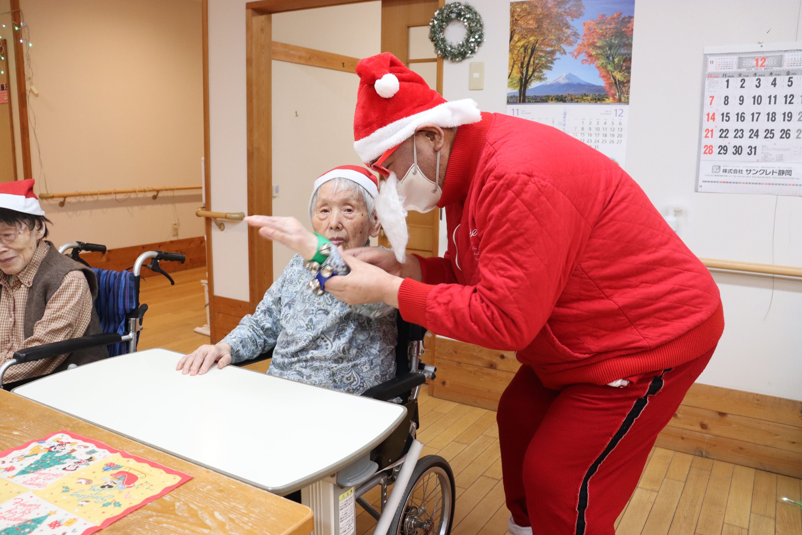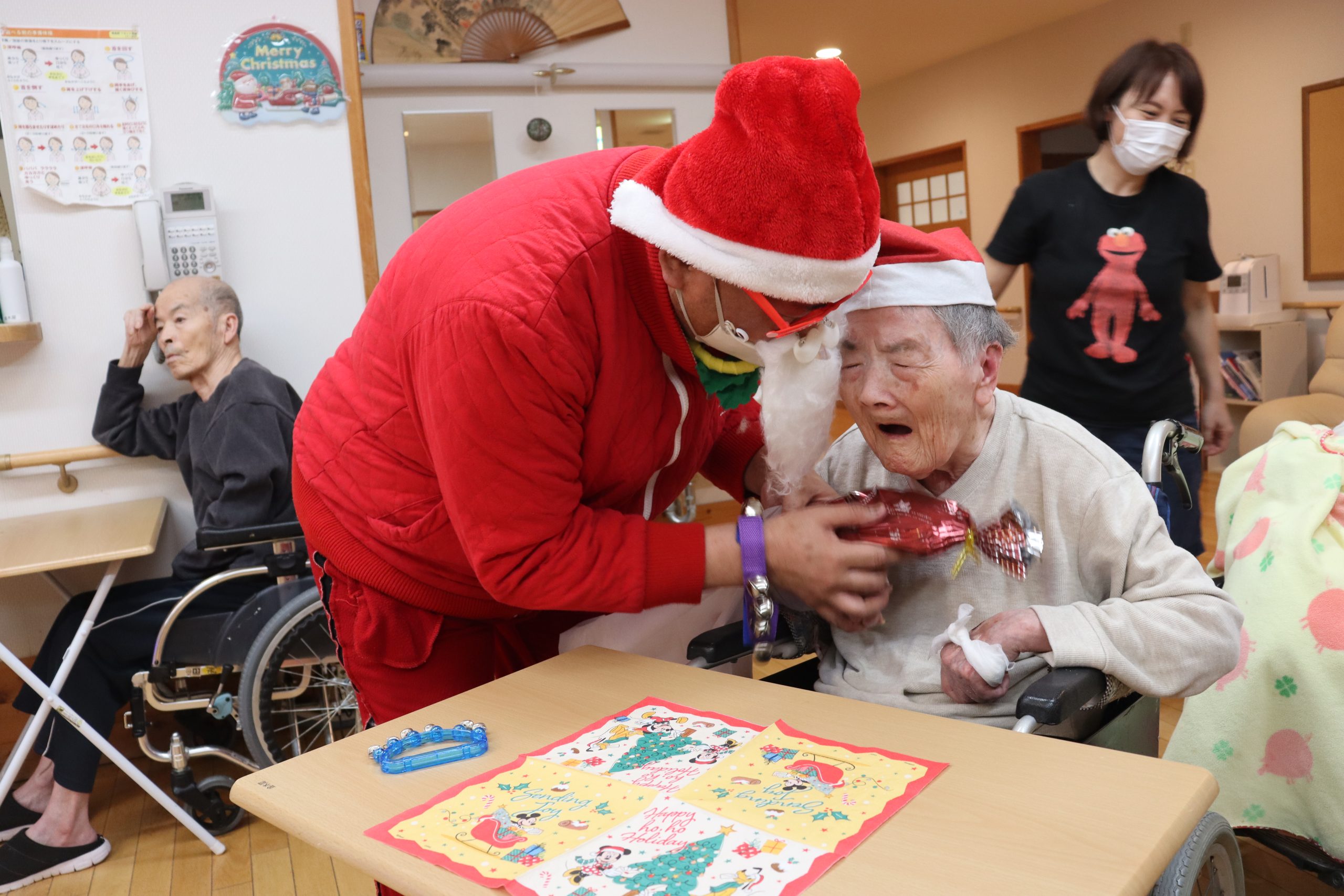 おやつの時間には帽子をかぶって鈴を鳴らして準備し、サンタさん登場です!