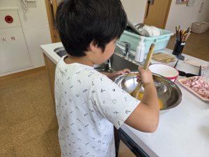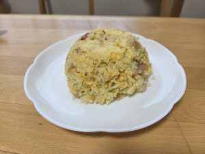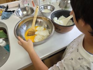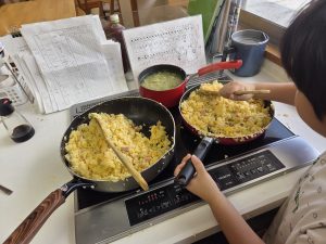 今日の昼ごはんはチャーハンです。子どもが手伝いたいというので、食材を切る以外の調理をお願いしてみました。
